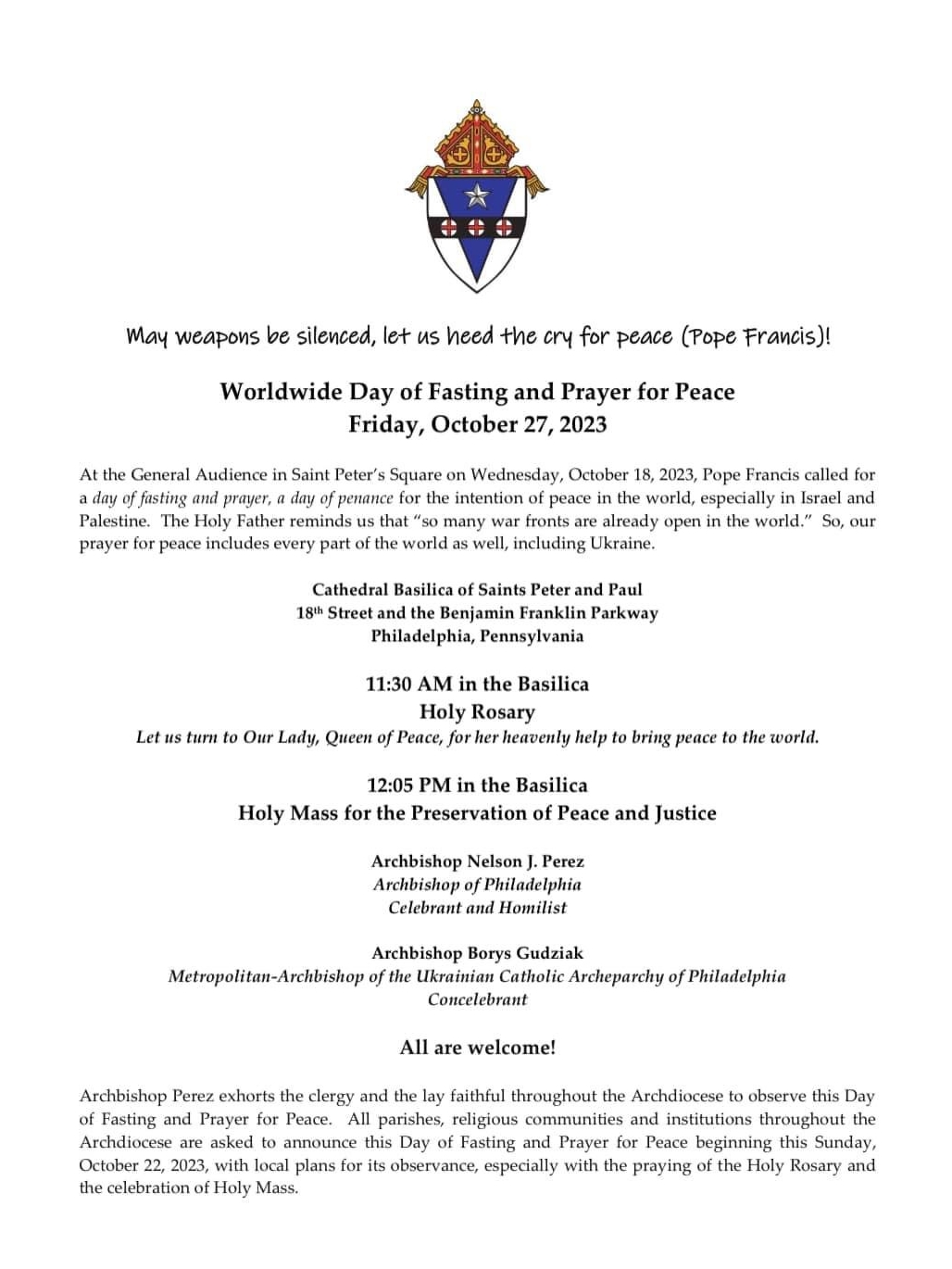 URGENT: CALLED TO PRAYER by Pope Francis & Archbishop Perez on 10/27
